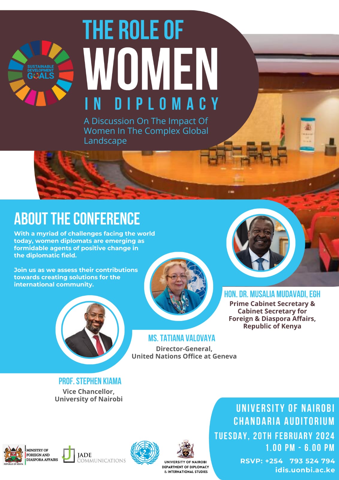 Today’s world faces a myriad of challenges. In the diplomatic field, the global landscape is complex. There is continuous effort to find sustainable solutions. In the mix are women diplomats emerging as formidable agents of positive change.Just what is their impact? Is it tangible? How can it be quantified?Join The Republic of Kenya’s Ministry of Foreign and Diaspora Affairs, the United Nations, Jade Communications Centre for Applied Human Communications and the University of Nairobi’s Department of Diplomacy and International Studies for a discussion to assess the contributions of women diplomats towards creating solutions for the international community.The conference is at the University of Nairobi’s Chandaria Auditorium on Tuesday, 20th February 2024, from 1 pm to 6 pm.